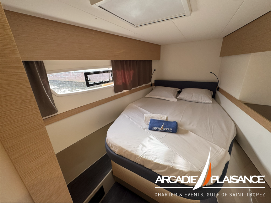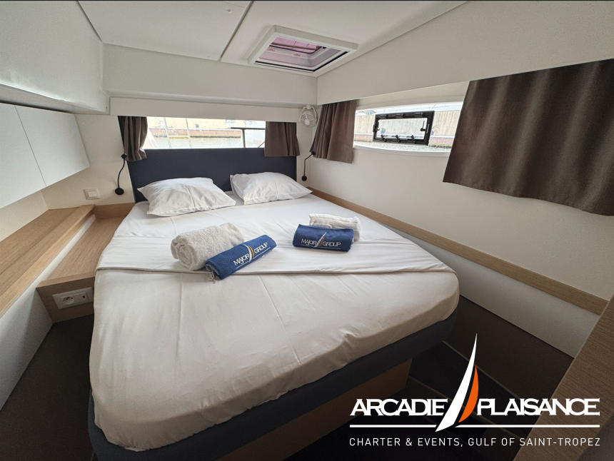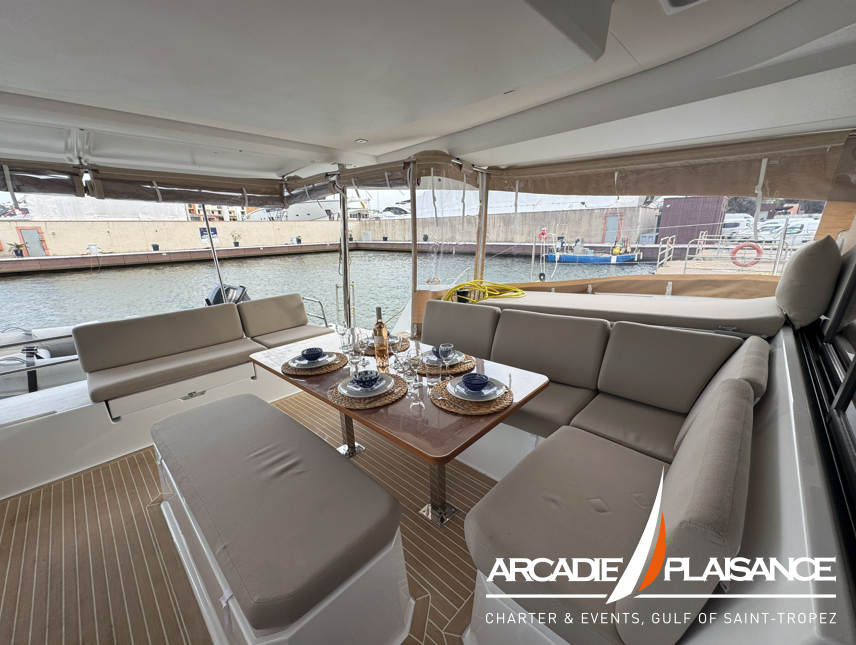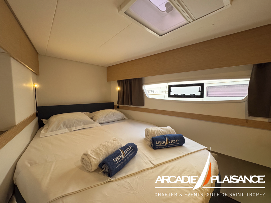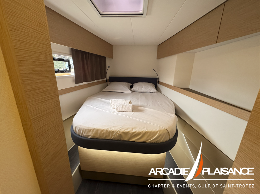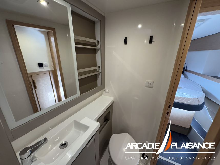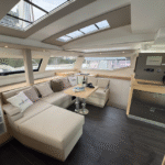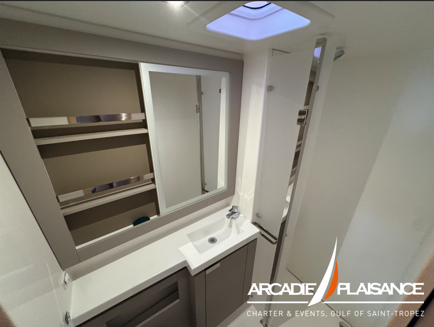 Baignées de lumière également, la suite propriétaire et les cabines invitées vous réservent calme, détente et confort, avec salles de bains privatives selon la version. Vous pourrez profiter d’espaces de détente au format « XXL » : à l’avant du bateau, sur le lounge deck, dans le cockpit, sans oublier le beach club et les panneaux solaires.