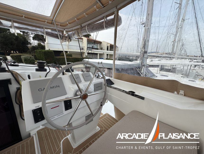 Ce catamaran dispose d’un poste de barre au design innovant, améliorant la manœuvrabilité et promettant de belles performances.