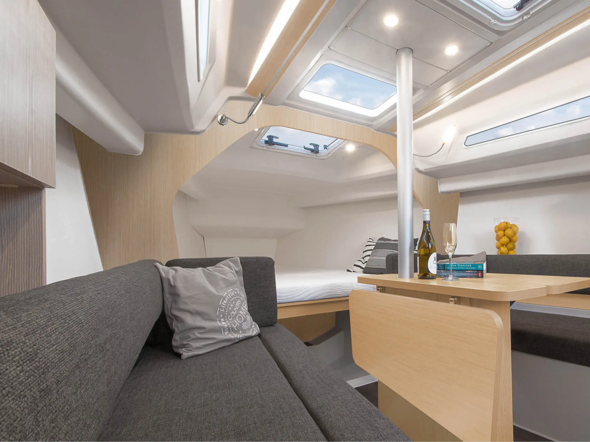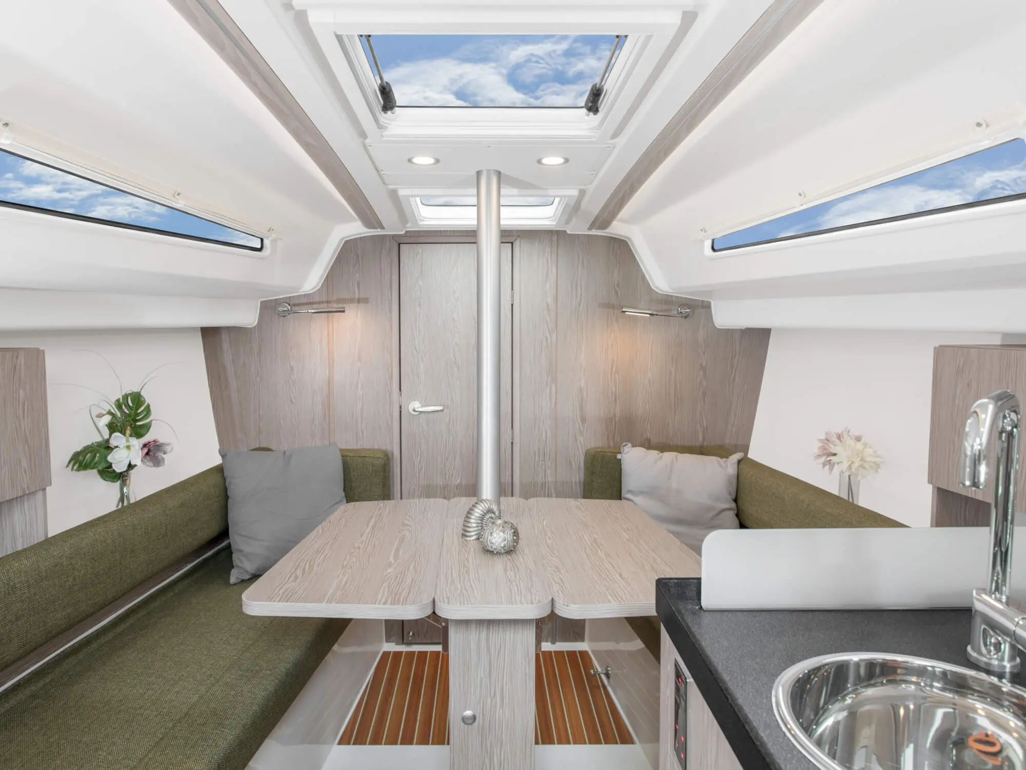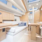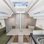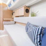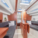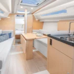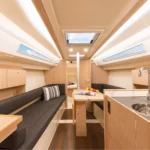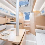 Le Hanse 315 offre suffisamment de place pour un équipage de quatre personnes. La descente présente une hauteur sous barrot appréciable de 1,91 m, pour 1,77 m dans la cabine avant. Cette généreuse hauteur sous barrot dans l’espace fonctionnel de la cuisine, de la descente et de la salle de bain est obtenue grâce à un plancher rabaissé, tout en conservant une ligne élégante et élancée pour le bateau.