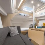 Dans le cockpit, une barre de chariot d’écoute facilite le réglage de la grand-voile. Le tableau arrière est ouvert, mais le cockpit reste extrêmement bien protégé par une plateforme de bain basculante, qui agrandit l’espace de jeu des enfants lorsqu’elle est en position ouverte.