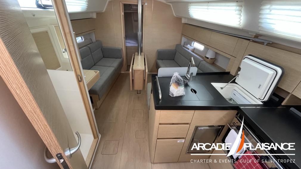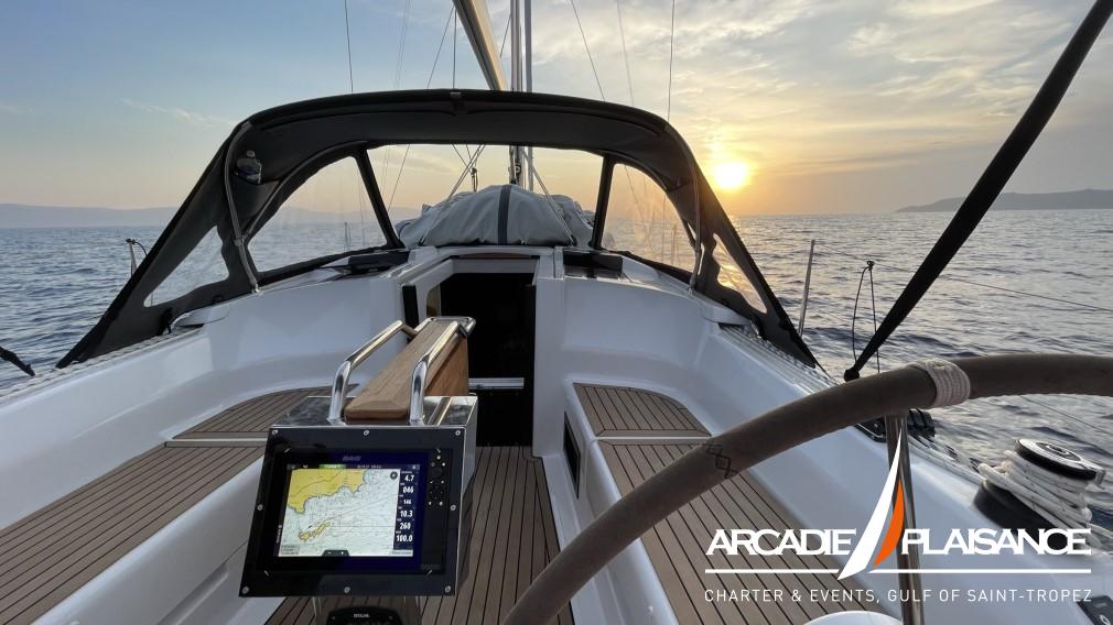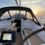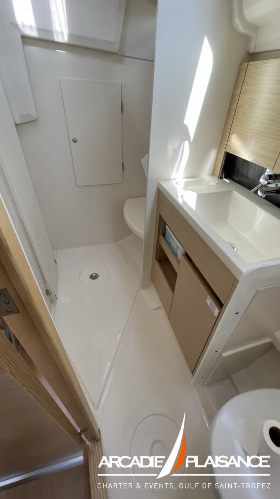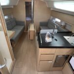 La grand-voile sur enrouleur simplifie les réglages et offre un réel confort d’utilisation, même en équipage réduit. Le bateau est également équipé d’un réfrigérateur, d’un système d’eau chaude et froide pour un confort optimal à bord, ainsi que des cartes marines et de l’ensemble des équipements de navigation et de sécurité nécessaires.