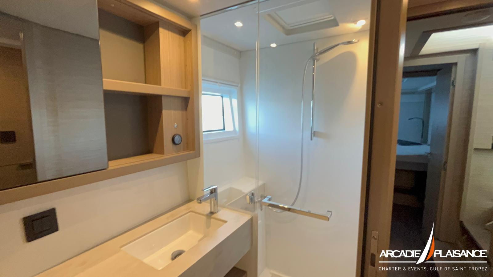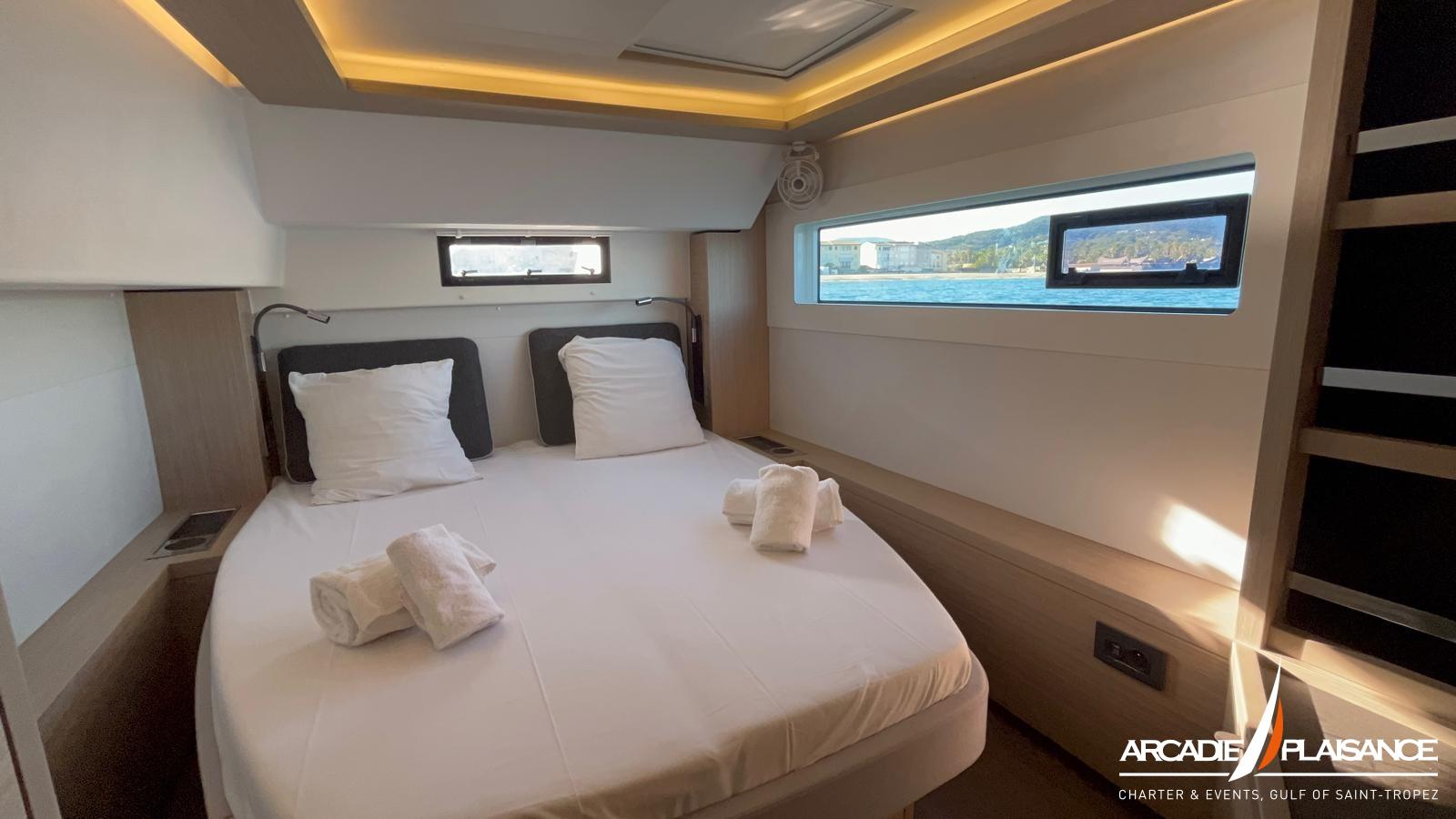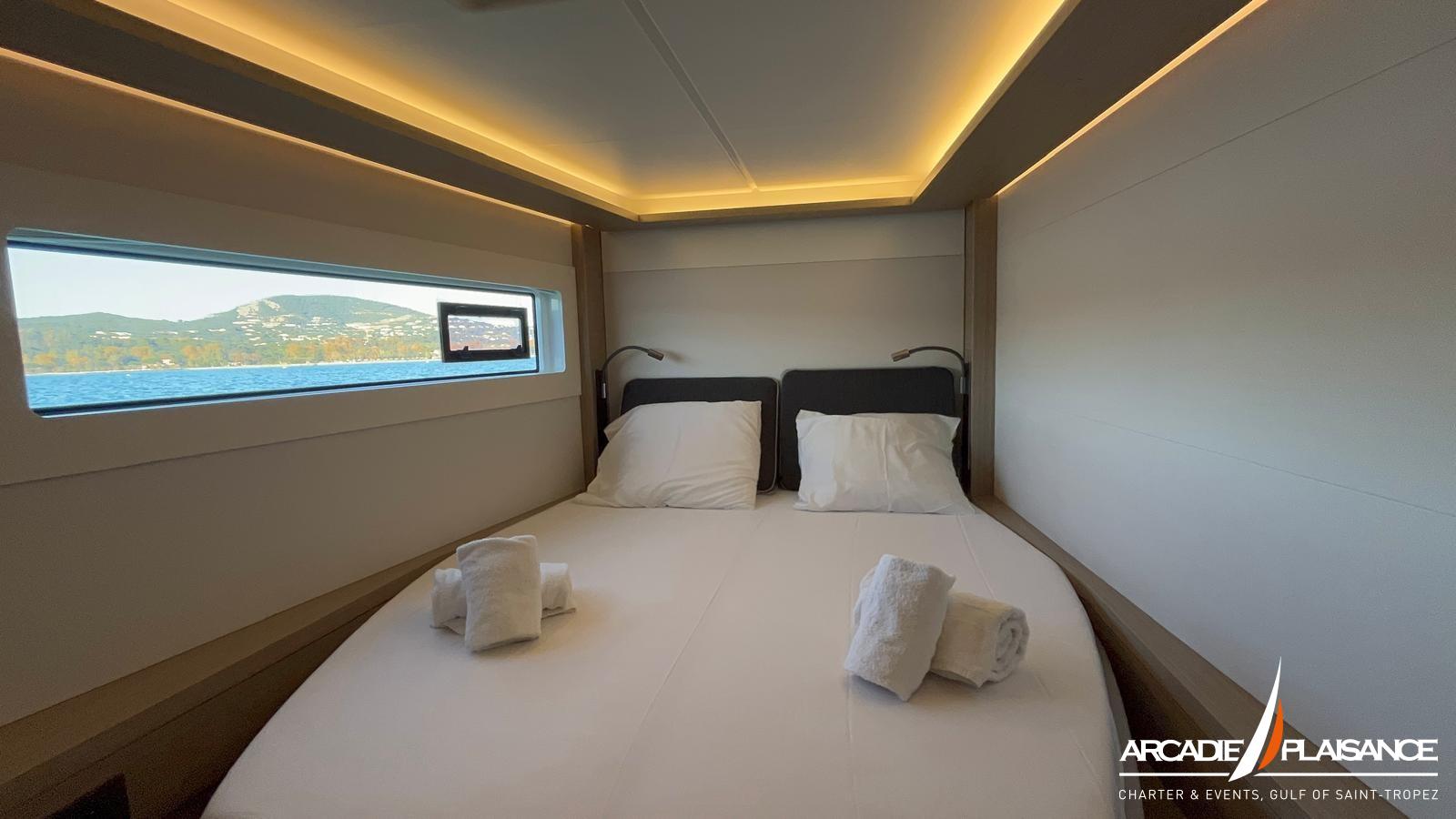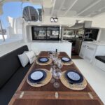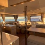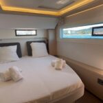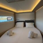 Louez le Lagoon 46 M&M (2025) : 4 cabines, 4 salles de bain, climatisation, générateur, panneaux solaires, et confort haut de gamme pour 8 personnes.