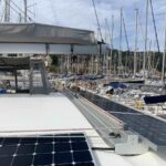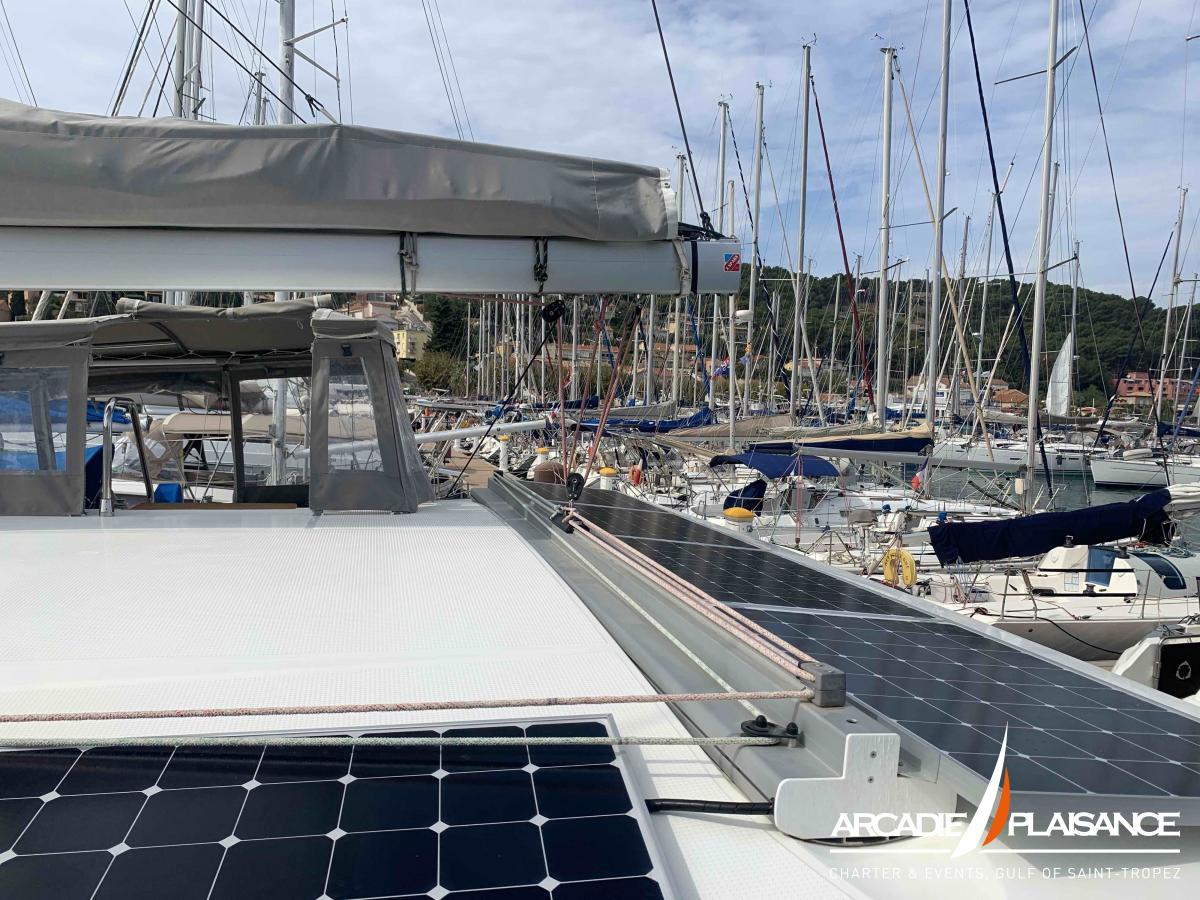 Notre catamaran « Marléa » est équipé des options suivantes : panneaux solaires, dessalinisateur, réfrigérateur, GV lattée, gennaker ou spi, winch électrique, barre à roue, radar, climatisation, ventilateurs, chauffage, télévision, micro-ondes et machine à café.